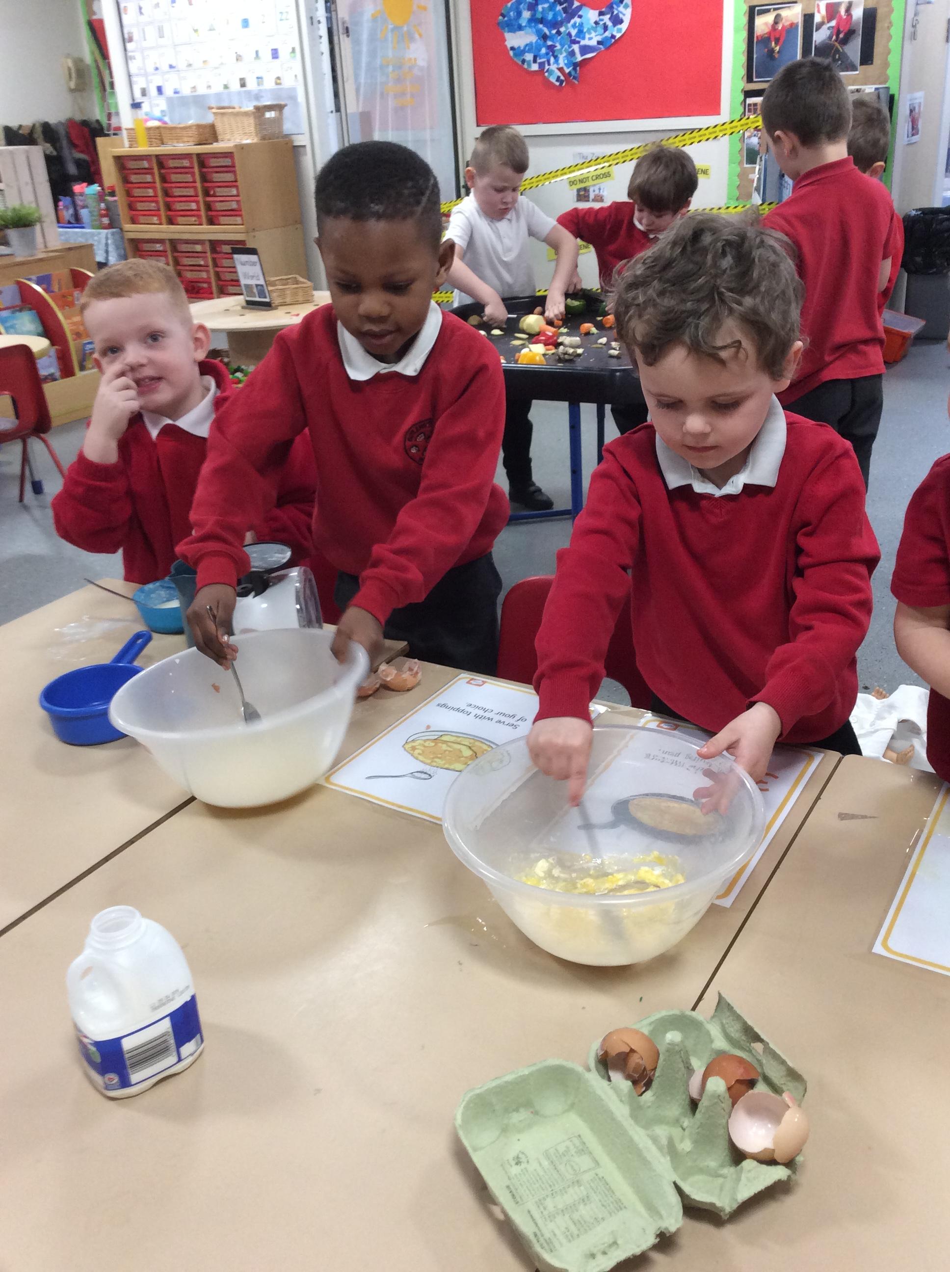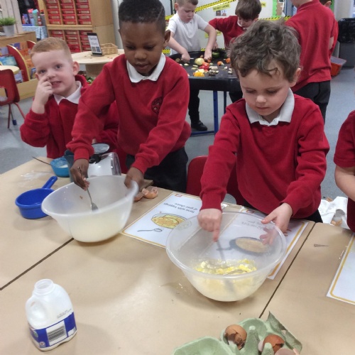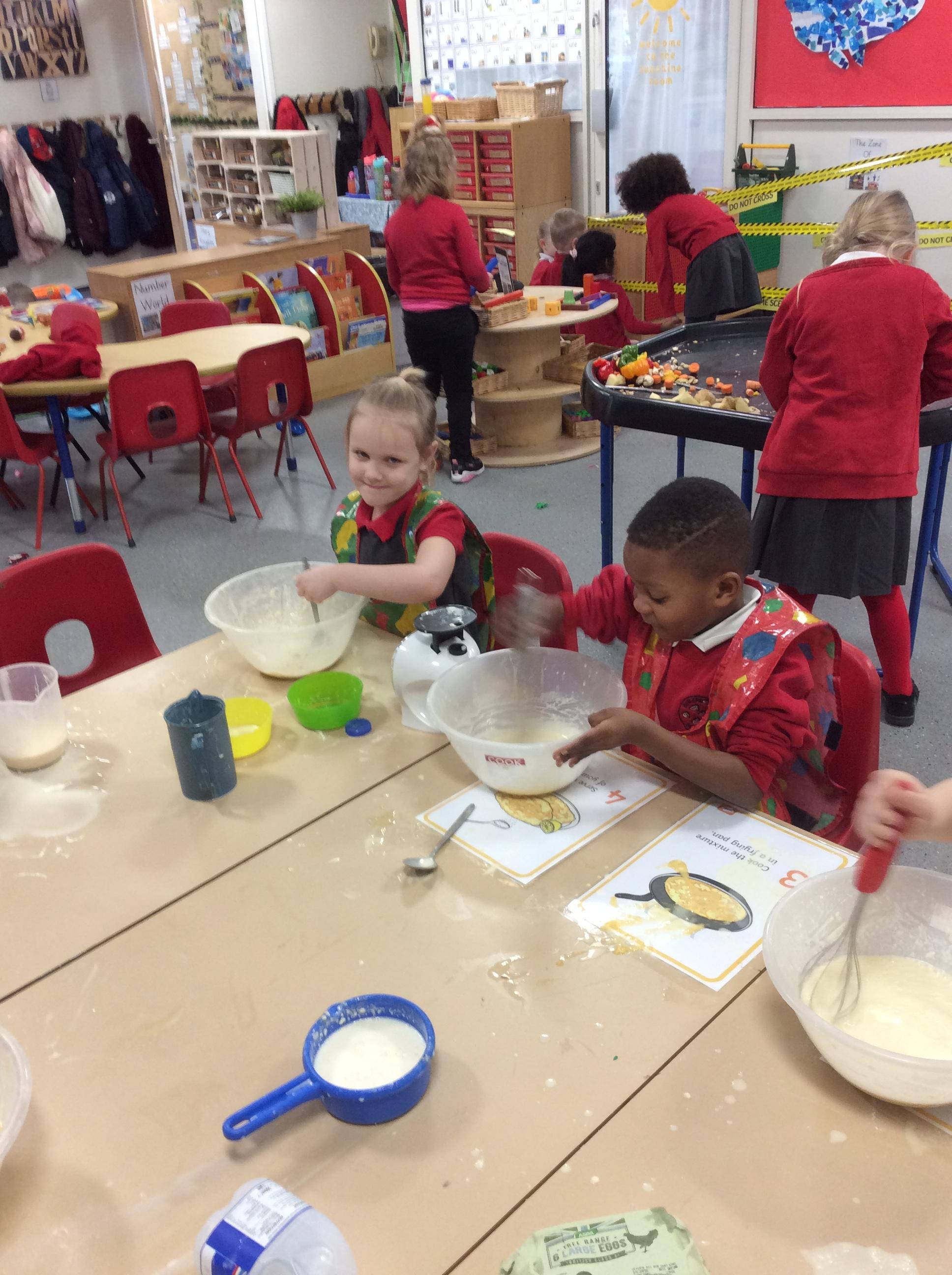 Children in F2 mixing the ingredients to create pancakes!