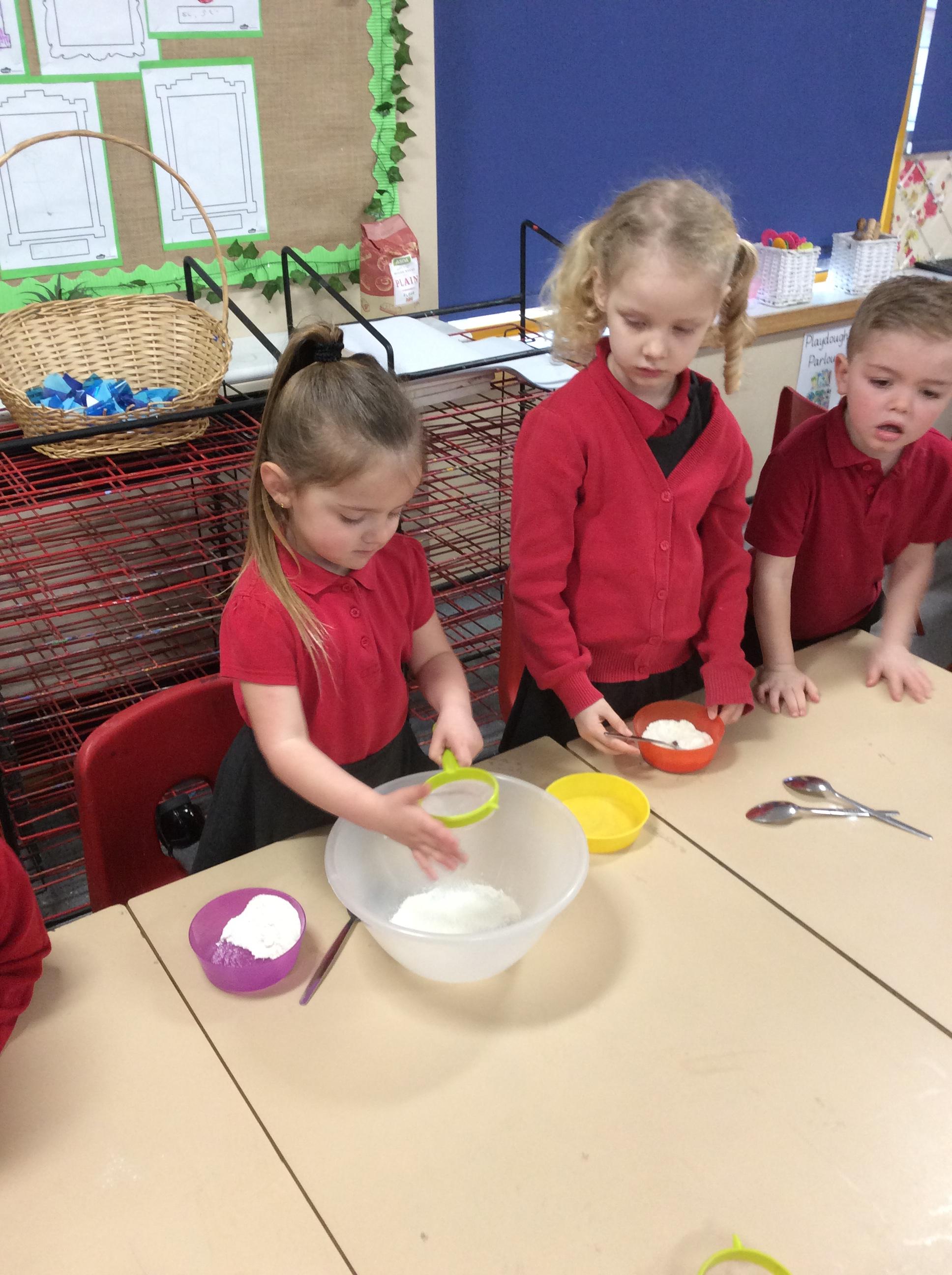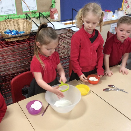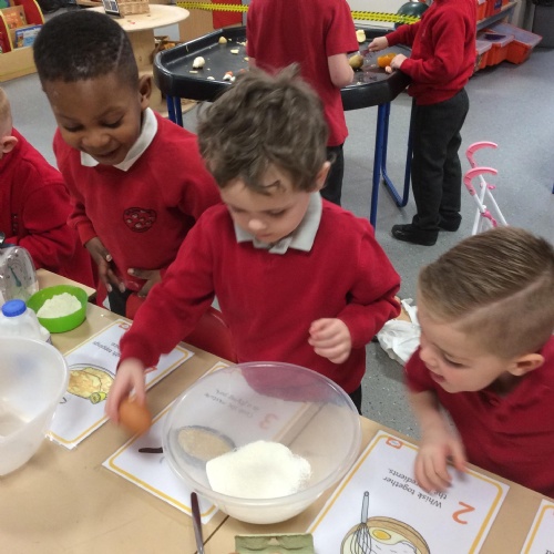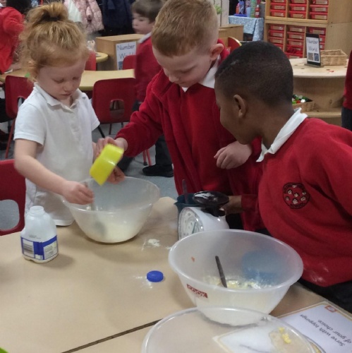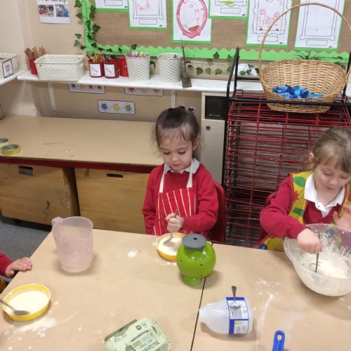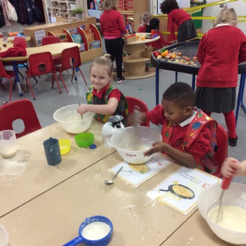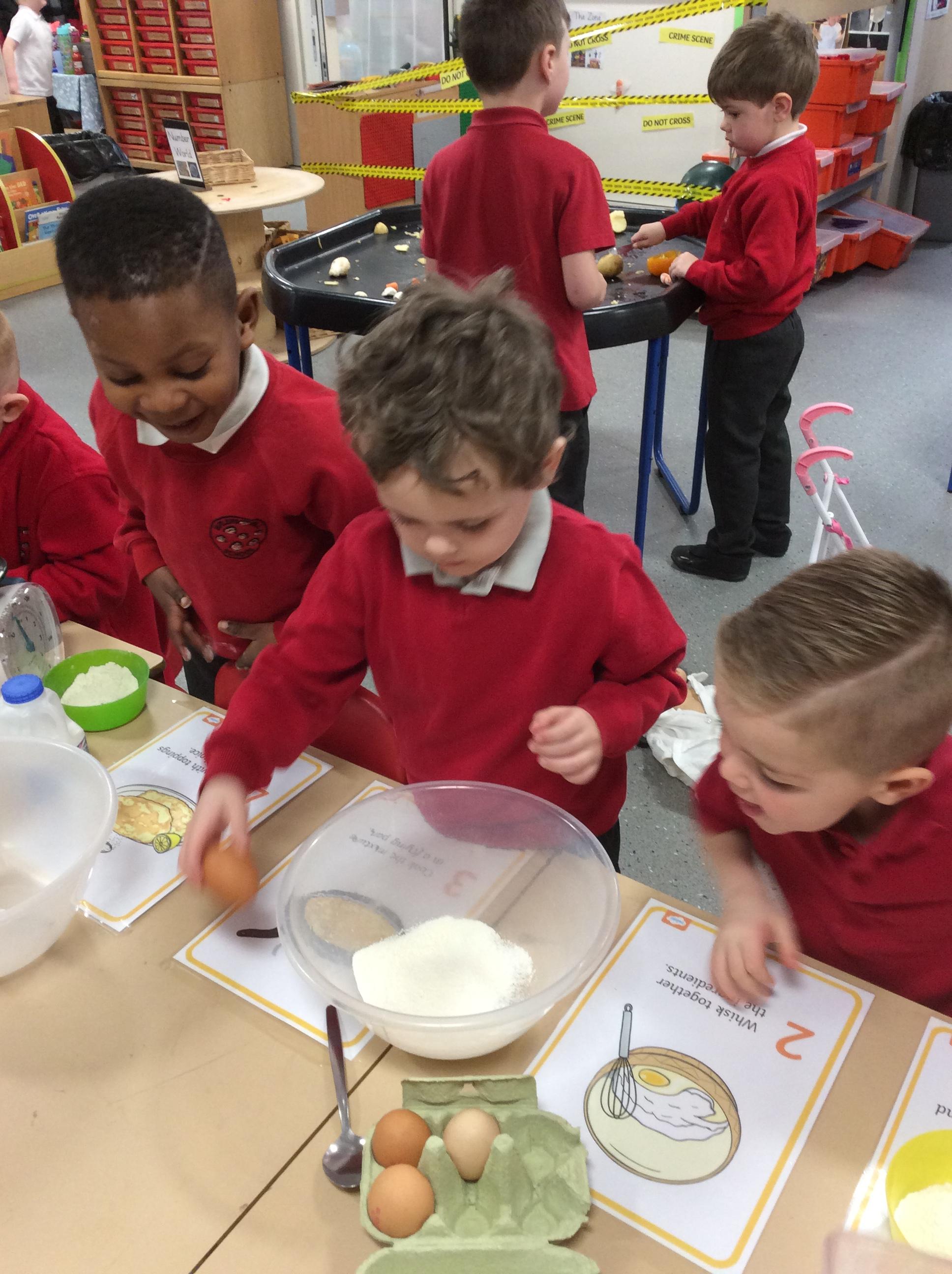 Children in F2 mixing the ingredients to create pancakes!